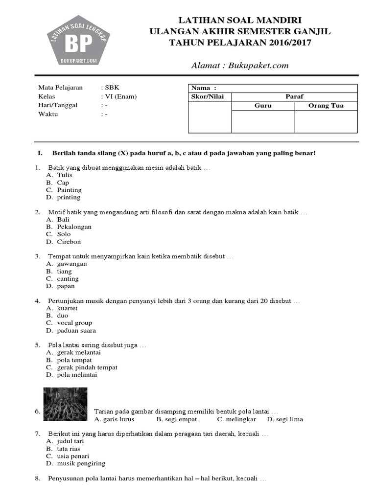 By guru merry posted on 23/02/2021. Soal seni budaya kelas 6. Tulis namamu di sudut kanan atas. Soal ukk pat kelas 6 sd mi k13 tahun 2021 dan kunci jawabannya. Soal ini sudah kakak sediakan dalam bentuk pilihan ganda dan essay yang terbagi menjadi dua pilihan beserta dengan kunci jawaban. Bila ada kekurangan, mohon simpan di kolom komentar. Contoh soal uas sbk kelas 6 sd lengkap dengan kunci jawaban. Ikuti informasi/artikel terbaru melalui fanspage facebook kami di supervba. Periksa kembali pekerjaanmu sebelum diserahkan pada pengawas. Soal ujian akhir praktek mapel mulok seni budaya dan keterampilan sbk untuk kelas 6 sd mi. Soal bahasa jawa kelas 6 semester 2 dan kunci jawabannya. Berikut kami petikkan beberapa contoh soal dan kunci uas 1 mapel sbk kelas 6/ vi sd terbaru yang hendak anda download tersebut: Mid semester atau ulangan tengah semester itu diadakan untuk mengetahui daya serap para anak didiknya dalam menerima pelajaran selama 3 bulan.