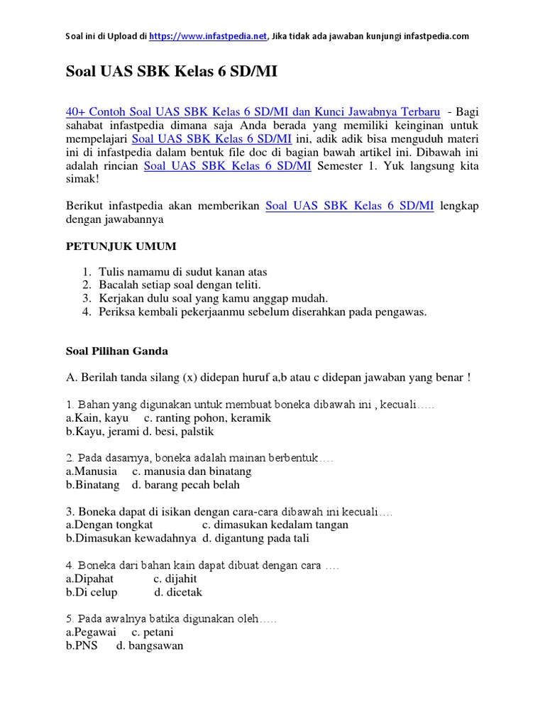 By admin materi posted on may 17, 2021. Ikuti informasi/artikel terbaru melalui fanspage facebook kami di supervba. Kisi kisi soal uts sbk kelas 6 semester 1. Berikut ini dibagikan contoh soal ukk pat kelas 6 sd mi k13 tahun 2021 dan kunci jawabannya. Contoh soal uas sbk kelas 6 sd lengkap dengan kunci jawaban.